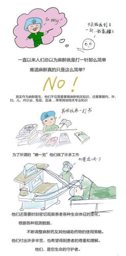 您可能从来都见不到他们的全脸,也记不住他们的样子,可是您要知道,这些带着帽子口罩的麻醉医生和台上的手术医生一样!都是最关心您生命安危的人。